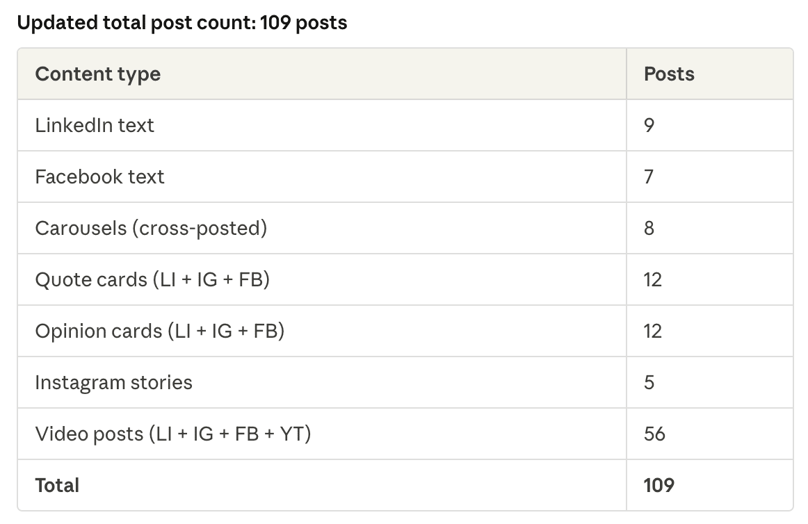 Yo! Just published a new YT video about the content system I crafted that enables omnipresent marketing. This bad boy can have you appearing on feeds, platforms, and channels all day every day with next to no effort. You can watch it here. But here's the fun bit. The system I talk about in the video... I used it on this video. My AI System looked at the transcript and has turned this one video into a whopping 109 pieces of content that it's already scheduled to be published over the next 7-10 days. All of these will be in my tone of voice and expressing my genuine opinions and research, cause they draw from my initial video. So no basic AI Slop. Here's what it's created... Why am I publishing so much? Well, there's details in the video (all about the Mere Exposure effect), but it also helps me populate retargeting audiences for ads. With this run, I updated the system a little and that's about to go live in the GM+ repo. If you want access to the system and to turn single pieces of content into 100+ social posts for distribution, you can grab access by joining us in GM+ here. https://growthmodels.co/community Speak soon, Pete |